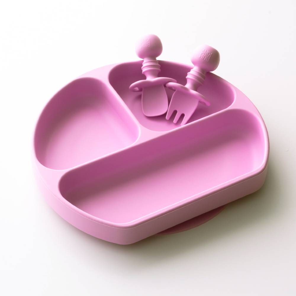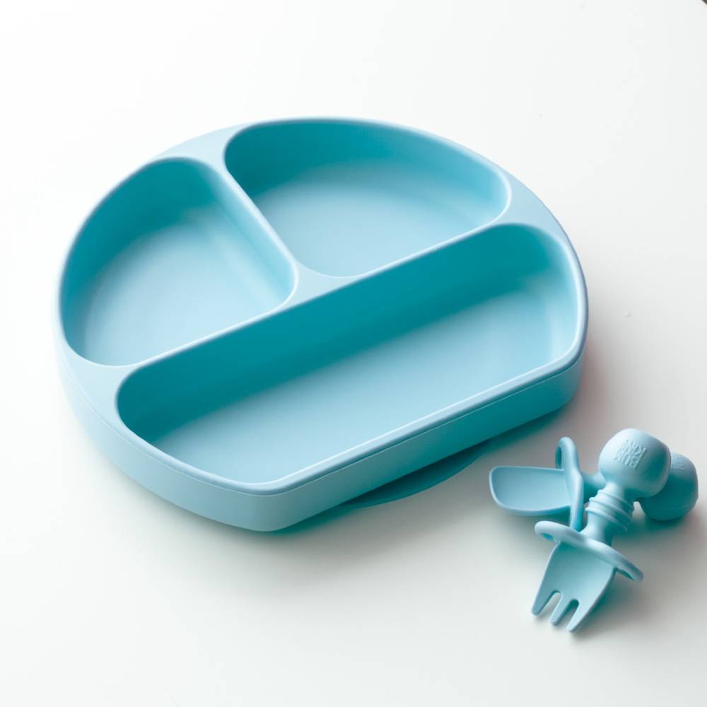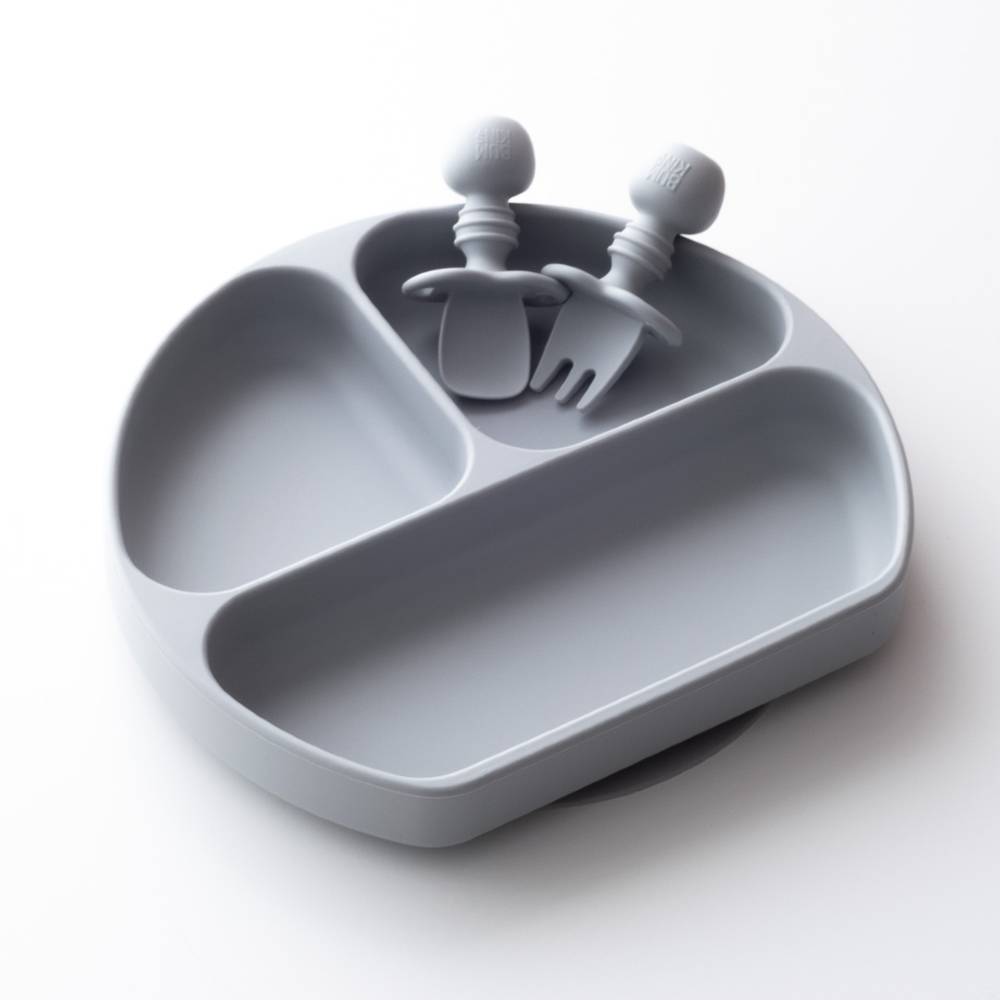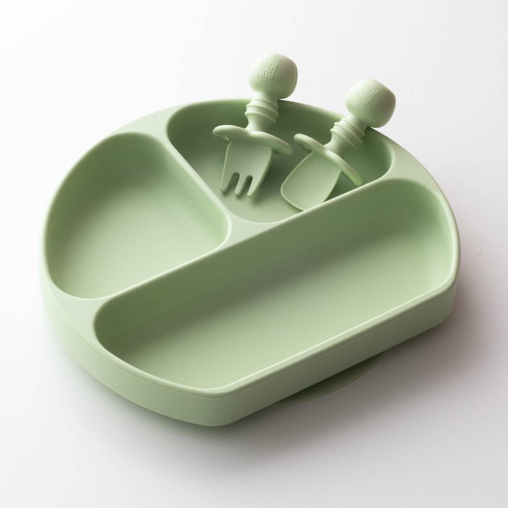 Set contains a fork and spoon. Do not leave baby unattended with product. Food grade silicone is durable, stain resistant, and doesn't harbour bacteria.