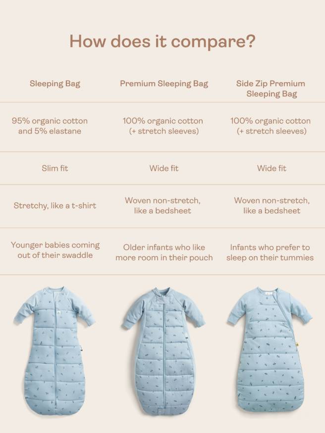Ensure you buy the correct size for your baby's weight, to prevent the pouch from riding up around your baby's face. See our Size Guide for more information.For sleep only. Do not allow a child to walk around when wearing the Side Zip Premium Sleeping Bag. Not suitable for use in a 5 point harness.