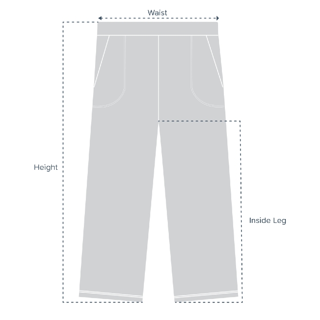 | Size | Height/Length | Waist (relaxed) | Inside leg | Suitable for size |