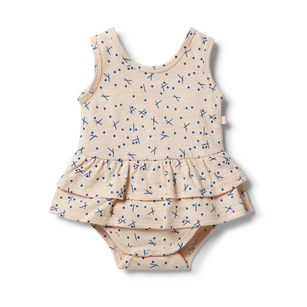 Wilson + Frenchy Ruffle Bodysuit $34.95 This beautiful Wilson + Frenchy ruffle bodysuit is made from a beautiful slub cotton. A sleeveless tank bodysuit featuring a two-tiered ruffle waist detail and a snap crotch opening for easy nappy changes.HighlightsTank shape at...