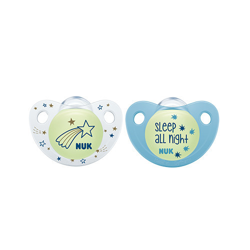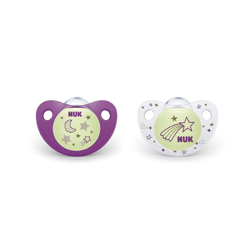 Nuk Glow in the Dark Dummies - 2 pack $14.95 NUK Glow in the Dark Soothers have an orthodontic NUK shape, an anatomically shaped mouth shield made of high quality plastic and a button which glows in the dark, the cheerful designs and colours are also stimulating during the...