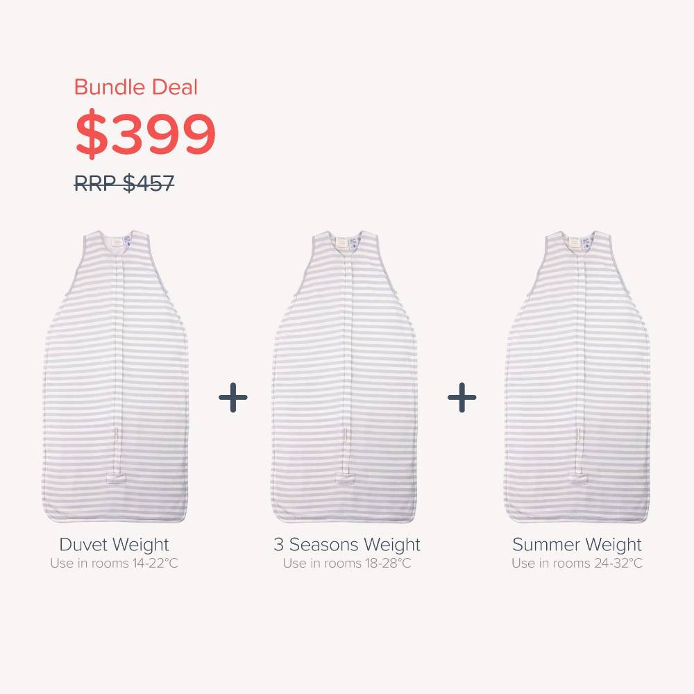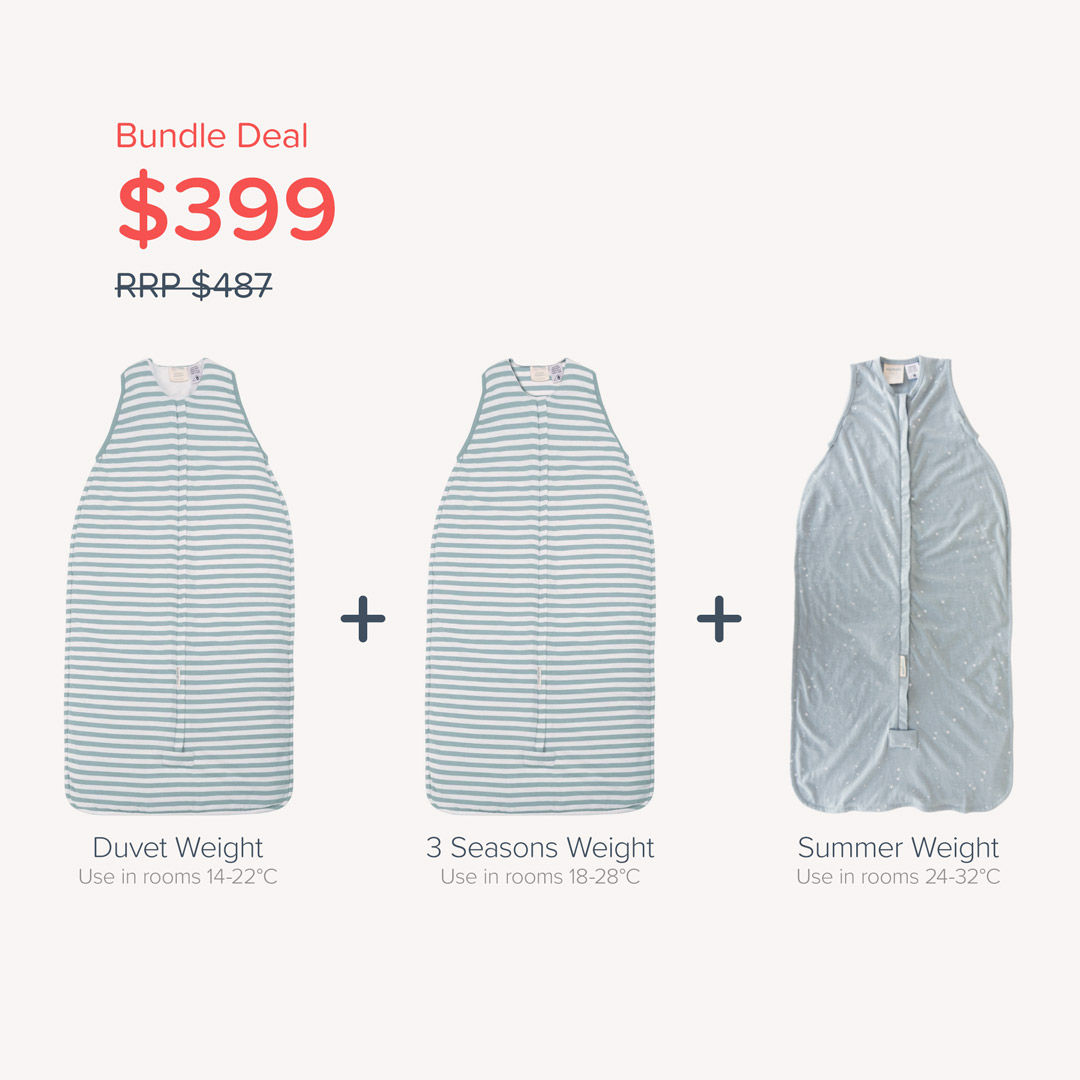 Lightweight merino and 0.2-0.5 Tog baby sleeping bags are designed to be used for day sleeps in summer and the hottest nights of the year, usually for room temperatures above 25 degrees. A sleeping bag is a positive sleep association for babies and toddlers, so it's a good idea to continue to use a lightweight sleeping bag to indicate it's bedtime to your baby. They may only need a nappy or a nappy and a singlet on underneath the summer bag, depending on the temperature of baby's room. The Sleep Store has a range of lightweight, summer sleep sacks, including ultra-cool, breathable muslin bags, 0.2 and 0.5 Tog organic cotton bags and merino bags. Merino is great for wicking away moisture and helps to regulate baby's temperature. Our favourite summer bags include Woolbabe, Ergopouch Sheeting Bags and the gorgeous Little Unicorn muslin bags. Read more about choosing the best summer sleeping bag.